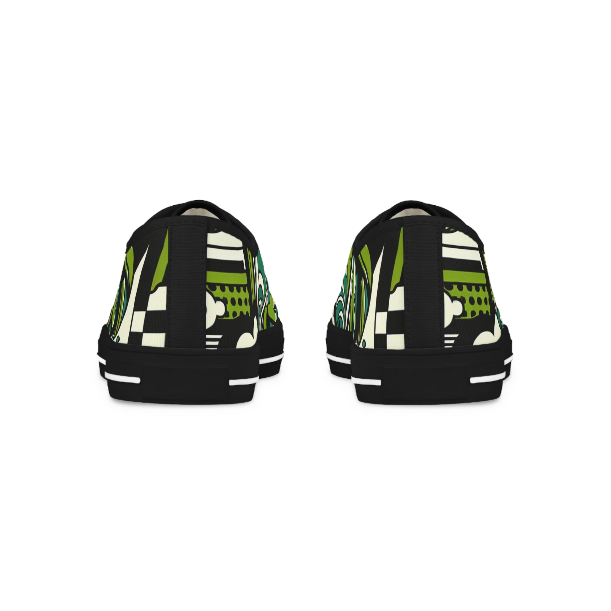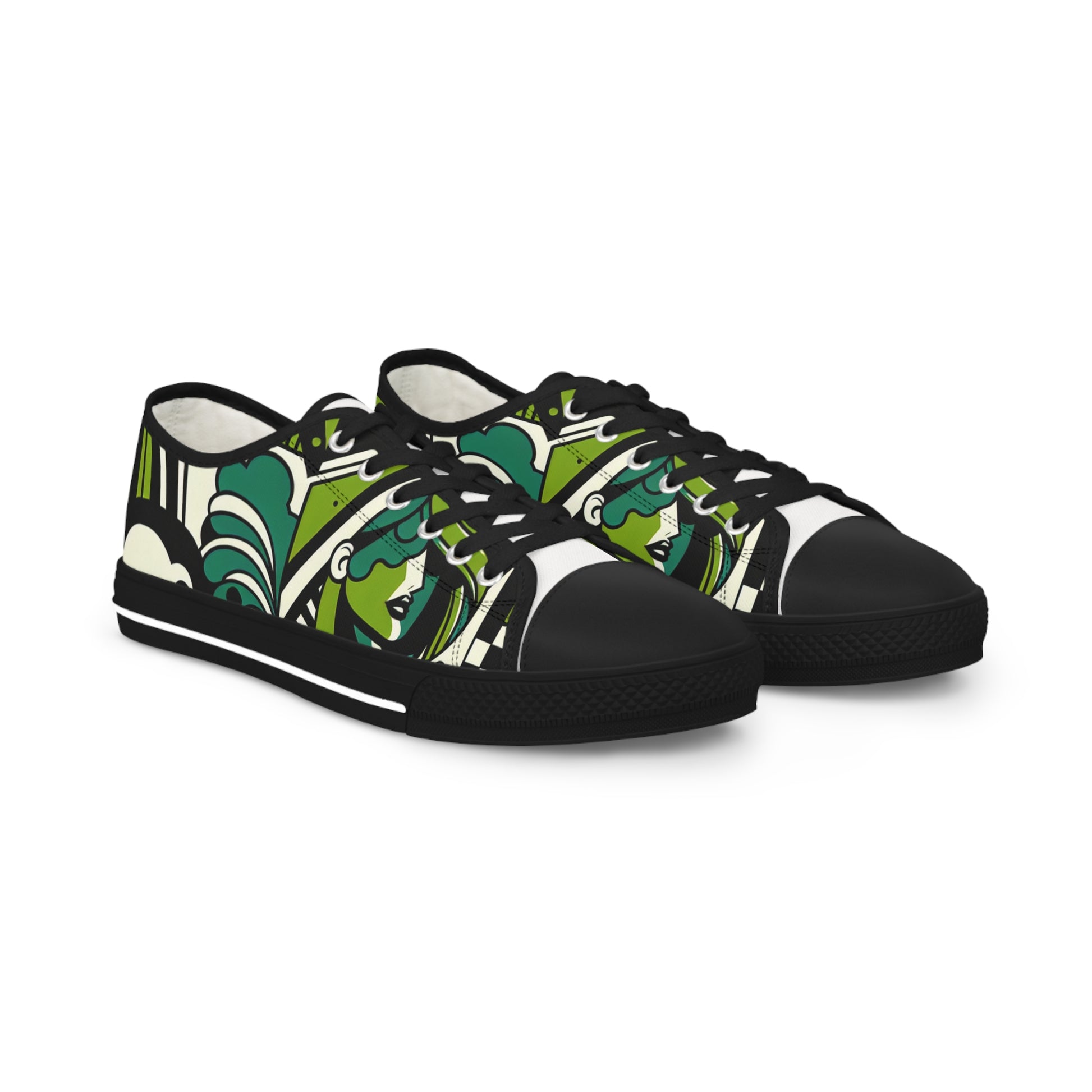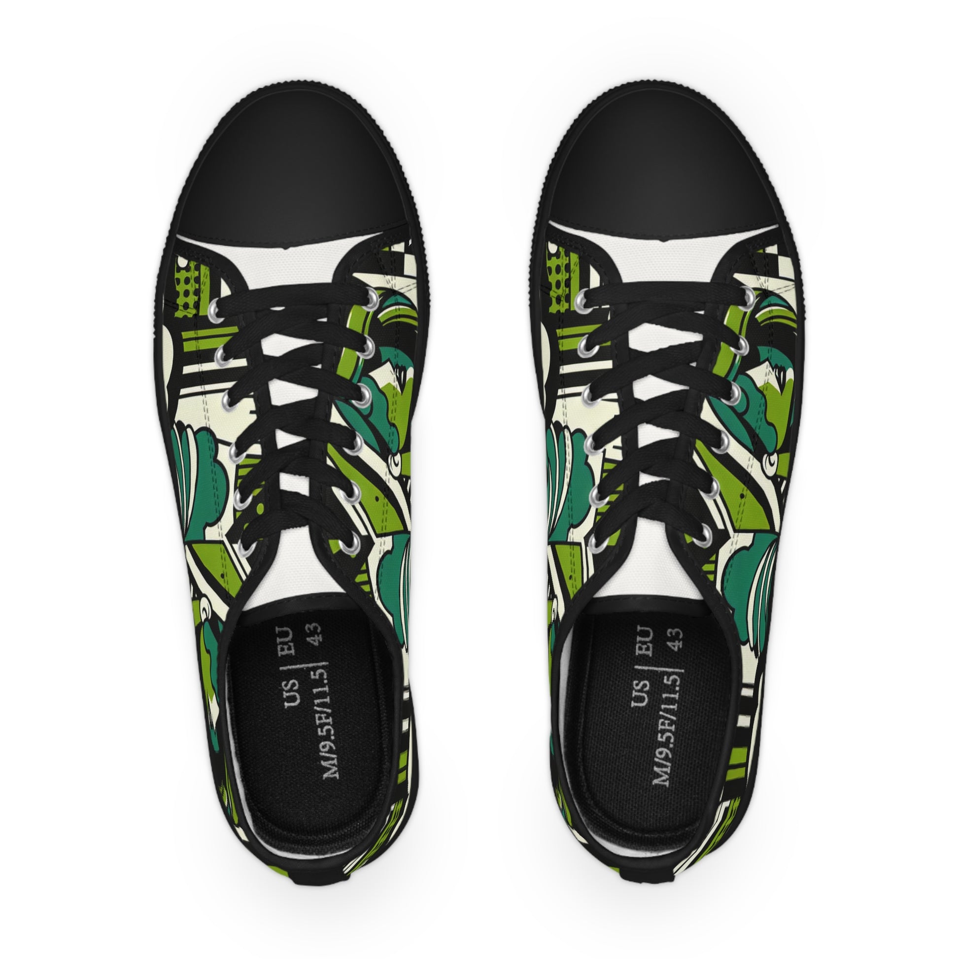 Show off your unique style with these low top sneakers. Featuring a pop-art design, they're adorned with green and black abstract cartoon characters that seem to pop off their canvas. Bold shapes outlined in thick black lines give a nod to the comic-style, while the dynamic and playful stylization of the figures adds a contemporary touch. The balance of large and small elements creates a visually striking composition that's both playful and sophisticated. High fashion meets pop culture in these must-have sneakers.